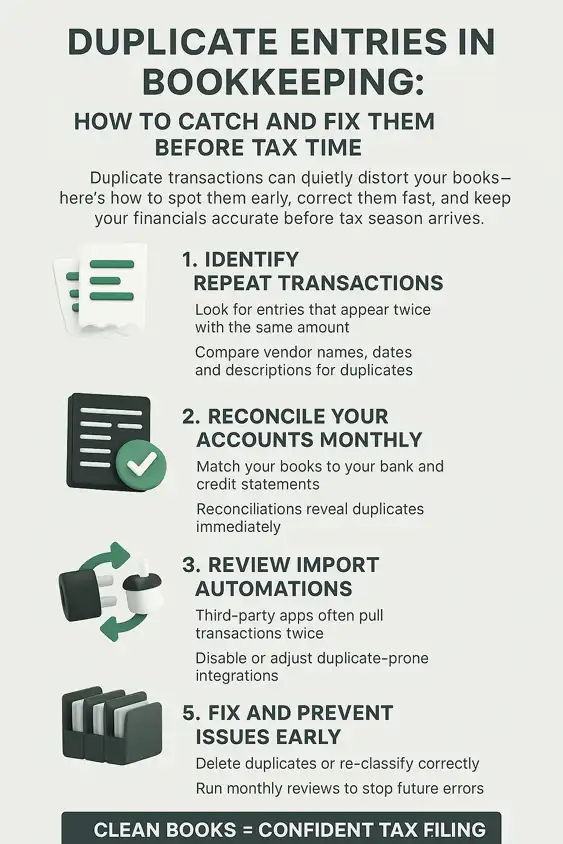 Fortunately, duplicate entries are preventable. A well-structured workflow, consistent categorization habits, regular reviews, and properly configured accounting software significantly reduce the likelihood of duplication. Many small businesses also improve accuracy by using outsourced accounting services, which help detect hidden duplicate transactions, strengthen internal controls, and maintain clean, reliable financial records.